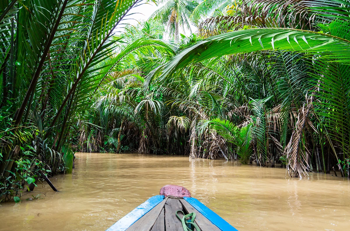 Tôt le matin, vous embarquerez à bord d’un bateau qui naviguera pendant 40 minutes sur le Mékong avant d’arriver à un marché local. Vous explorerez ce marché, typique du delta du Mékong, où les locaux se réunissent pour vendre légumes, fruits, poissons et viandes. Vous retournerez à bord du bateau pour poursuivre votre balade. En passant devant un barrage, vous apprendrez pourquoi ce système est utilisé dans la région du delta du Mékong puis vous ferez un arrêt dans un temple Cao Dai bordant le fleuve. Puis, vous visiterez une usine de noix de coco où sont fabriqués d’impressionnants tapis. Vous continuerez la journée en découvrant la campagne à vélo, en passant sous les cocotiers, au milieu des rizières : un cadre qui offre d’infinies possibilités de faire des photos. Après l’activité à vélo, vous retournerez au lodge. L’après-midi, poursuivrez avec un tour de bateau vous emmenant à la découverte d’un petit canal du delta du Mékong, à l’ombre des cocotiers et bercé par le son des clapotis des rames. Nuit au lodge.