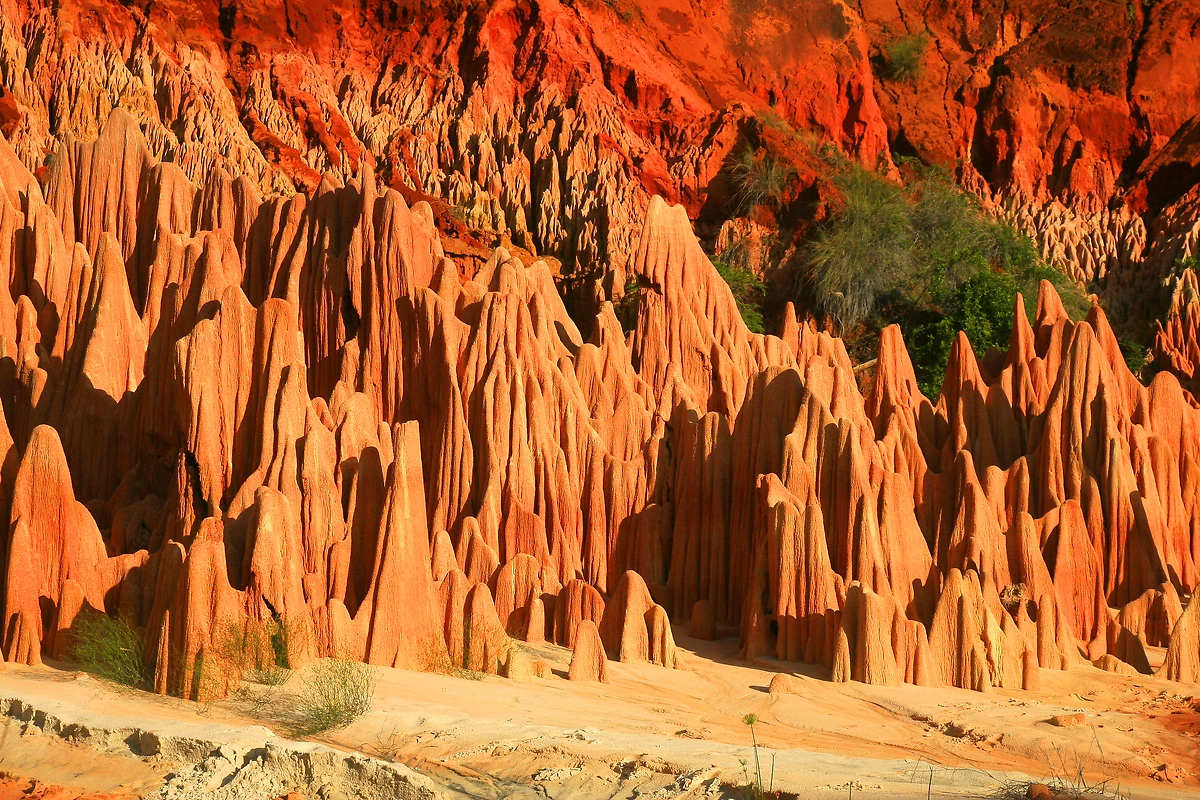 Départ après le petit déjeuner pour rejoindre les Tsingy Rouges. Après une petite heure de route, vous quitterez la route nationale pour 45 minutes de piste environ, vers les Tsingy Rouges. Nous descendons vers le Grand Canyon pour découvrir ces impressionnantes formations éphémères d’argile et de calcaire. Ce sont le ruissellement des eaux de pluie et les caprices du vent qui ont façonné ces pics colorés et fantasmagoriques, uniques à Madagascar : les Tsingy Rouges. Nous reprenons la même piste jusqu’à la route nationale, puis direction Mahamasina. Déjeuner réservé dans un restaurant local. Dans l’après-midi, nous partons pour deux heures de balade pour une première approche des Tsingy. Le parcours Tsingy Rary nous emmène à travers canyons et points de vue. Avec un peu de chance, nous pourrions apercevoir quelques lémuriens couronnés ! Dîner et nuit au camp.