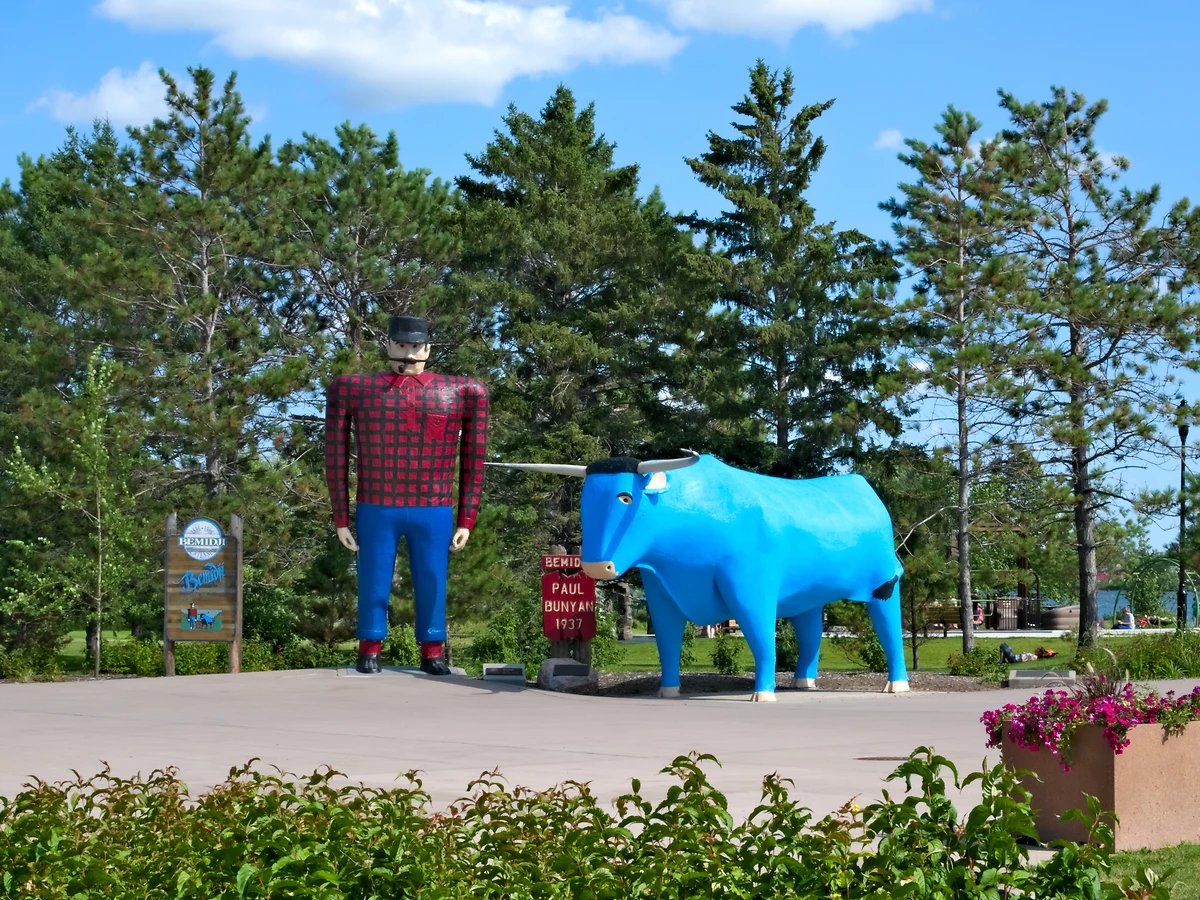 Cap au sud en empruntant la Highway 71, qui plonge droit vers Bemidji à travers forêts et prairies, ponctuées de lacs d’un bleu étincelant, les paysages typiques du Minnesota. Bifurquez dans la belle « Chippewa National Forest », connue pour sa grande population de pygargues à tête blanche, qui survolent ce vaste territoire sauvage, constellé de 1300 lacs. A la lisière ouest de cette forêt, vous atteignez Bemidji, ancien village de bûcherons, dont la statue géante de l’un d’eux, Paul Bunyan, accompagné de son boeuf bleu, nourrit le folklore local. Mais la région s’enorgueillit avant tout d’être le lieu de naissance du puissant fleuve Mississippi, qui prend sa source dans le lac Itasca, au coeur du parc d’Etat éponyme, et parcourt ensuite 3 780 km jusqu’au golfe du Mexique. Traversez le chemin de pierre à la source du fleuve, vous aurez selon la légende, une vie longue et heureuse.