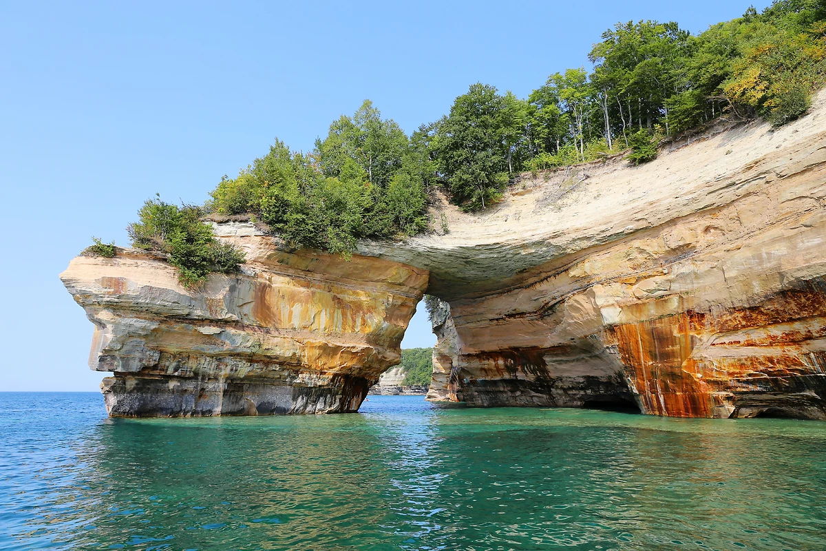 A l’instar des coureurs de bois français, premiers explorateurs de la région, profitez du fabuleux spectacle environnant la baie de Grand Traverse, en rejoignant l’antique phare « Old Mission Lighthouse », au bout de l’étroite route de crête 37, qui serpente vers le nord à travers les vignobles et la plus grande concentration de cerisiers du pays. Suivez ensuite la « Cherry Orchards Drive », itinéraire utilisé par les Amérindiens, les trappeurs puis les missionnaires jésuites, qui file au nord en direction du détroit de Mackinac. Cette route bucolique à souhait, traverse des champs de cerisiers prolifiques et de denses forêts, au feuillage époustouflant à l’automne. Jalonnée de typiques cités balnéaires posées sur les rives accueillantes du lac Michigan, elle vous réserve de jolis points de vue sur les baies de Grand et Little Traverse, de belles surprises sur la plage de Petoskey et au coeur de la charmante bourgade Bay View. Avant de passer le spectaculaire « Mackinac Bridge », qui enjambe sur 8 km le détroit éponyme, faîtes l’achat d’un fameux « fudge », ce caramel mou très prisé dans la région, et visitez au « Colonial Michilimackinac National Historic Site », la reconstitution d’un fort colonial et d’un comptoir de traite de fourrures construits en 1715, afin d’en apprendre un peu plus sur l’historique et officielle présence française dans ces contrées lointaines. Rejoignez ensuite Munising, sise aux portes du fabuleux « Pictured Rocks National Lakeshore », dans l’isolée et encore très sauvage « Upper Michigan Peninsula ».