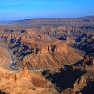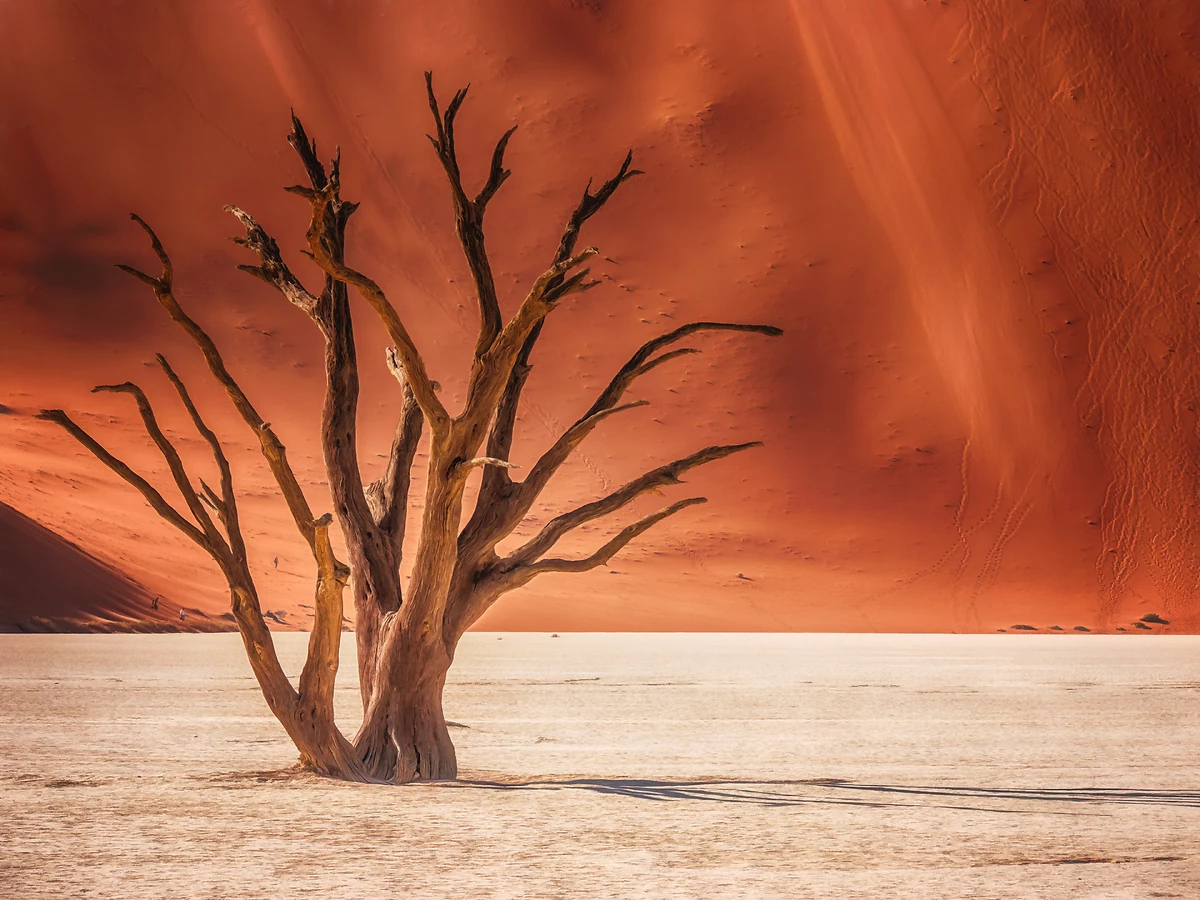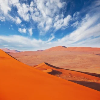 Collation matinale et départ avant l’aurore avec les véhicules 4 x 4 du lodge pour découvrir les dunes de Sossusvlei et Dead Vlei. Auparavant inaccessible, car faisant partie de la zone diamantifère interdite, Sossusvlei est ouvert au public depuis 1977. Toute la splendeur du désert du Namib se concentre dans ce parc protégé, avec une mer de dunes dont les dunes géantes, les plus hautes du monde, atteignent, pour certaines 300 m. de hauteur. Toutes les teintes se dévoilent en fonction de la course du soleil, du rose au violet, de l’orangé pâle au rouge vif. Une palette prestigieuse dont les artistes sont le vent et la lumière. Brunch au milieu des dunes. Route vers la sortie du parc et après-midi libre avec marche possible au canyon de Sesriem. Nuit au lodge.