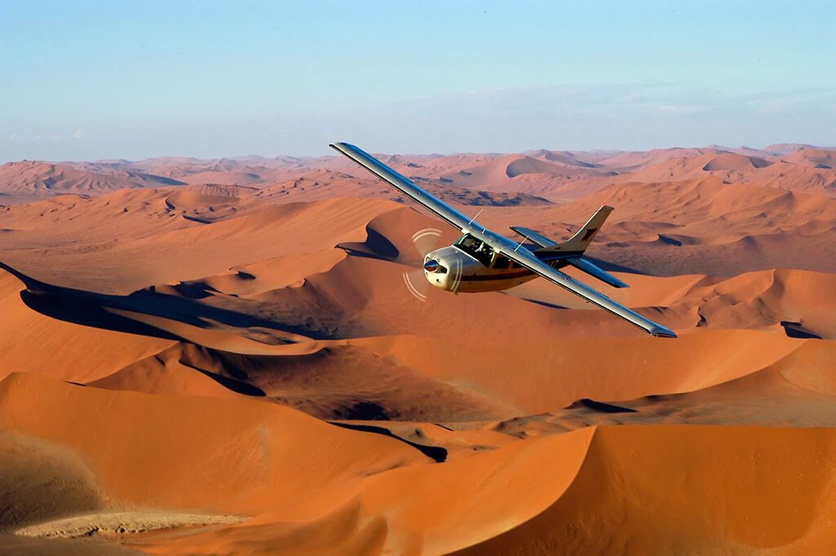 Transfert matinal vers la piste d’aviation et départ en avion privé vers Swakopmund. Visite libre de cette ville balnéaire. Retour à l’aéroport et envol vers le désert du Namib. Survol des dunes de Sossusvlei, des anciens camps des chercheurs de diamants, des bateaux échoués et de Concession Bay (environ 3h20 de vol dont l’arrêt pour le ravitaillement à Swakopmund). Arrivée et déjeuner au lodge. Après-midi libre, puis excursion avec le lodge au coucher du soleil. Nuit au lodge.