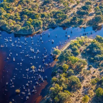 Envolez-vous vers le Botswana, à Maun, et découvrez le delta de l’Okavango qui offre de somptueux paysages. Le survol du delta est une expérience inoubliable. Vous observerez les animaux pendant les safaris dans un univers aquatique et semi-aquatique. Le delta regorge de petites îles, de paysages variés et d’une faune extraordinaire notamment : crocodiles du Nil, hippopotames, troupeaux de buffles, éléphants, oiseaux.