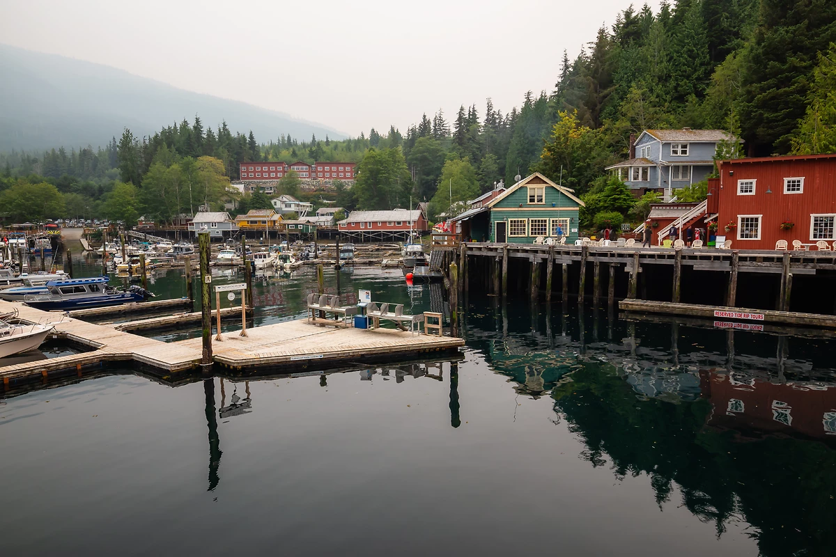 Vous reprenez la Route 28 qui vous ramène à Campbell River, puis vous mettez le cap au nord en suivant la « North Island Highway » serpentant à travers les montagnes côtières couvertes de denses forêts de résineux. Vous longez un temps le très beau lac Nimpkish, situé sur le territoire traditionnel de la Première nation Namgis. La route passe au-dessus de la rive est du lac, offrant une vue imprenable sur les pentes boisées escarpées de la chaîne de Karmutzen encadrant les eaux limpides dans lesquelles elles se reflètent. Arrivée dans l’après-midi à Telegraph Cove, dont les dernières maisons sur pilotis surplombent les eaux pures du détroit de Johnson, où des centaines d’orques attirés par les fonds graveleux, viennent en été frotter leurs flancs et se débarrasser des parasites.