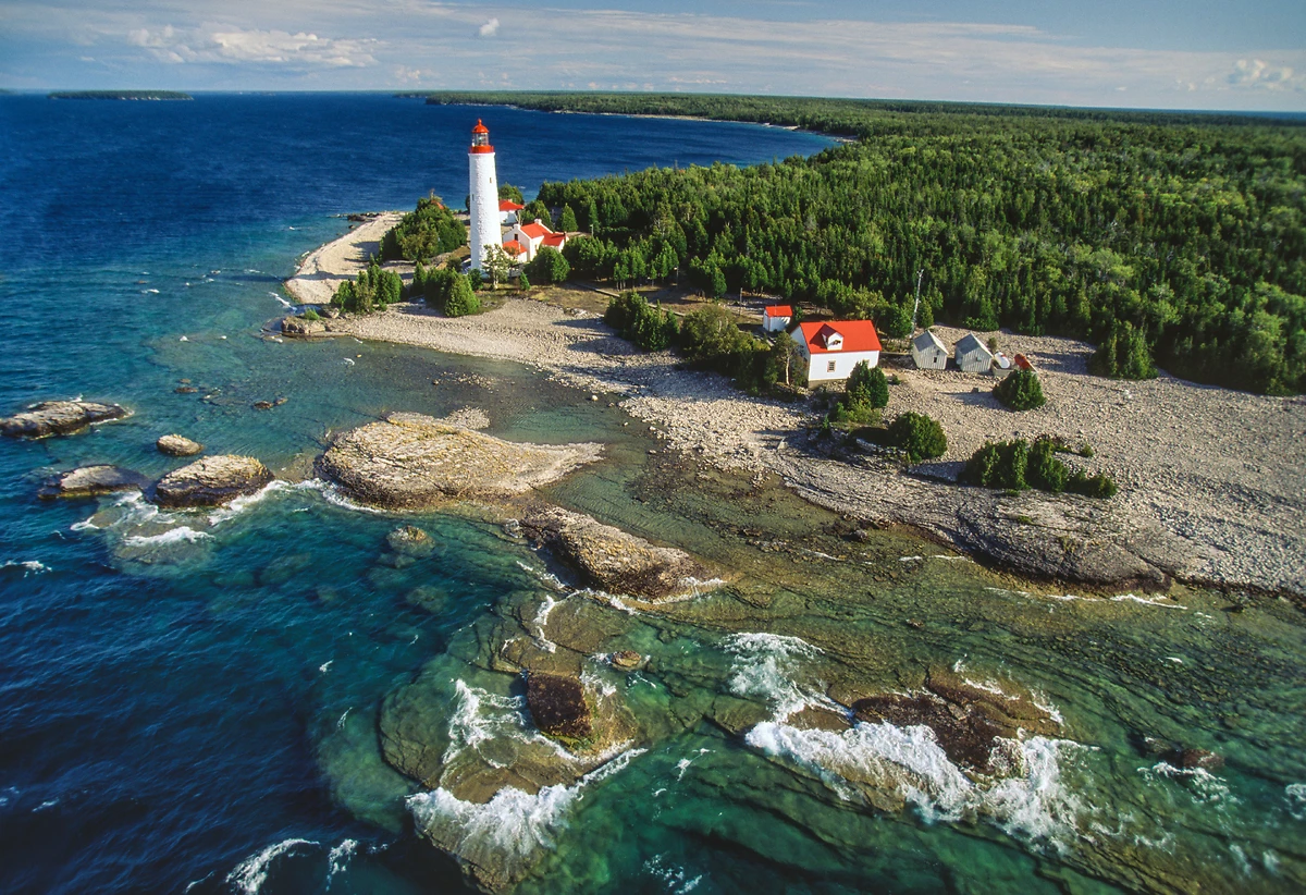 Rendez-vous matinal à South Baymouth et embarquement à bord du ferry qui navigue sur les eaux bleu vif de la baie Georgienne, et vous mène à Tobermory à travers le merveilleux parc marin national Fathom Five. La clarté exceptionnelle de l’eau fait de cette aire marine protégée la Mecque des plongeurs autonomes qui peuvent explorer à loisir grottes côtières et surtout une vingtaine d’épaves particulièrement bien préservées, gisant sur les hauts-fonds. Si vous désirez rester au sec, des bateaux à fond transparent, partant du port de Tobermory, offrent des vues fantastiques sur la zone des épaves avant de faire le tour des îles préservées du parc, dont l’île Flowerpot est le joyau. Vous pouvez l’atteindre également en zodiac et partir flâner ensuite sur ses sentiers balisés qui vous mèneront aux falaises côtières, desquelles vous pourrez observer les éperons rocheux érodés, formant d’étonnantes sculptures naturelles en pot de fleurs, qui donnent son nom à l’île.