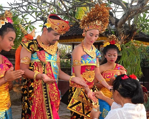 Vivez un mariage balinais traditionnel célébré dans une maison balinaise traditionnelle. Vous partirez vers le village de Kemenuh où notre rituel commence par une cérémonie de purification, connue localement sous le nom de Melukat. Il s’agit de se débarrasser des mauvais esprits et de purifier le corps et l’âme. Ensuite, nous rencontrons une diseuse de bonne aventure et un prêtre pour avoir un aperçu de notre santé et de notre richesse potentielles. Il est alors temps d’entreprendre un payas agung, une transformation avec la tenue de mariage traditionnelle balinaise. Le processus complexe se poursuit avec une courte danse alors que nous entrons dans une cour pour une cérémonie Mekalan-kalan pour bannir la négativité. Ensuite, la cérémonie principale se déroule dans une maison balinaise, y compris une procession, appelée Bale Gede. L’événement comprend un déjeuner traditionnel. Après le repas, retour dans votre villa et temps libre. Nuit dans votre villa.