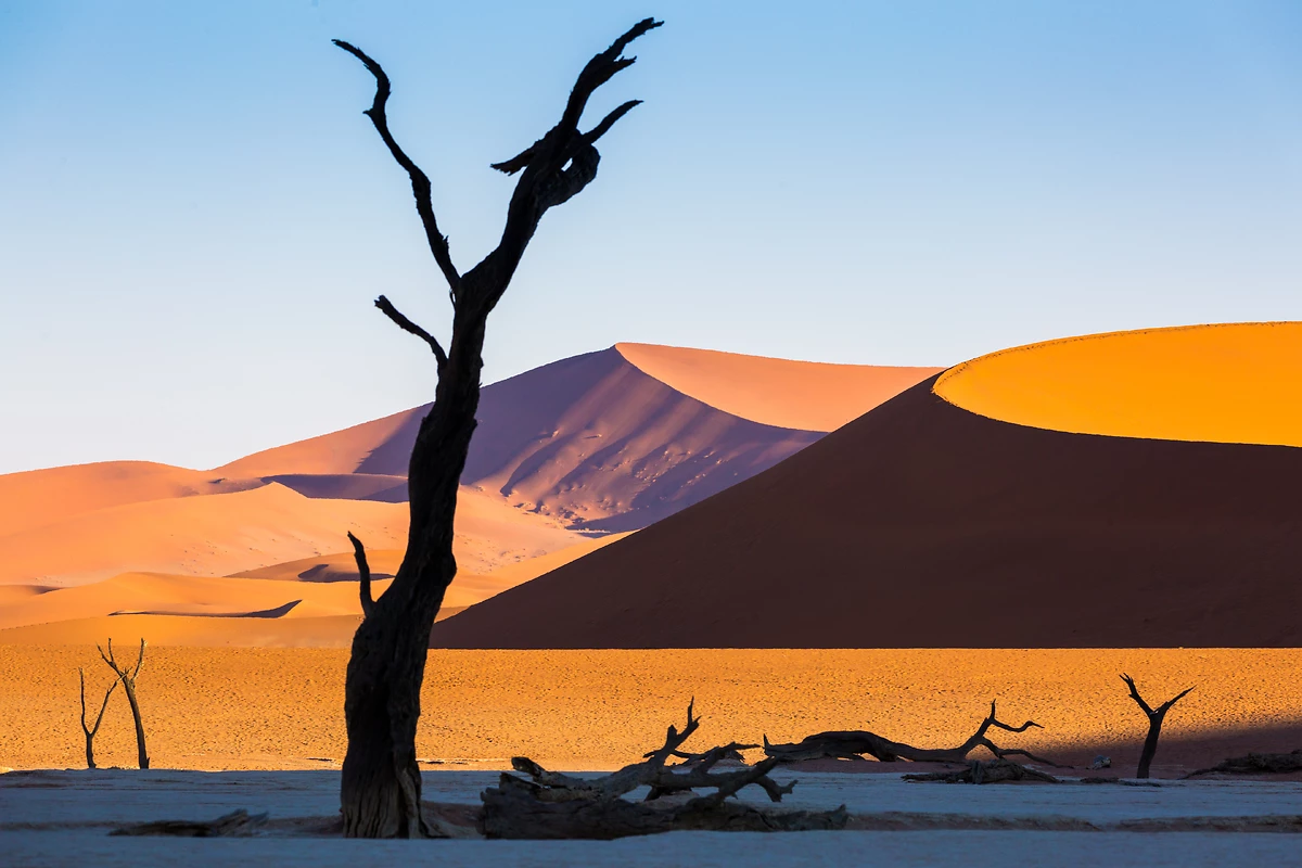 Nous vous conseillons de partir à l’aurore avec votre véhicule de location vers Sesriem (entrée à payer). Continuation vers Sossusvlei via la dune 45, la plus accessible des grandes dunes rouges bordant la route entre Sesriem et Sossusvlei. On y croise quelquefois des troupeaux d’Oryx, de Springboks et d’autruches. Les 5 derniers km pour accéder à Sossusvlei ne peuvent être effectués qu’en véhicule 4×4 ou à pied (Transfert à payer en supplément). L’ascension d’une dune de Sossusvlei vous permettra d’avoir une vue panoramique de ce site spectaculaire ou les dunes s’étendent à perte de vue. Possibilité de visiter le canyon de Sesriem (situé à environ 4.5 km de la réception de Sesriem), profond de 30 mètres. La Tsauchab, qui prend sa source dans le massif du Naukluft, a sculpté cette profonde faille dans les agglomérats rocheux et des dépôts de sable. Nuit au camp.