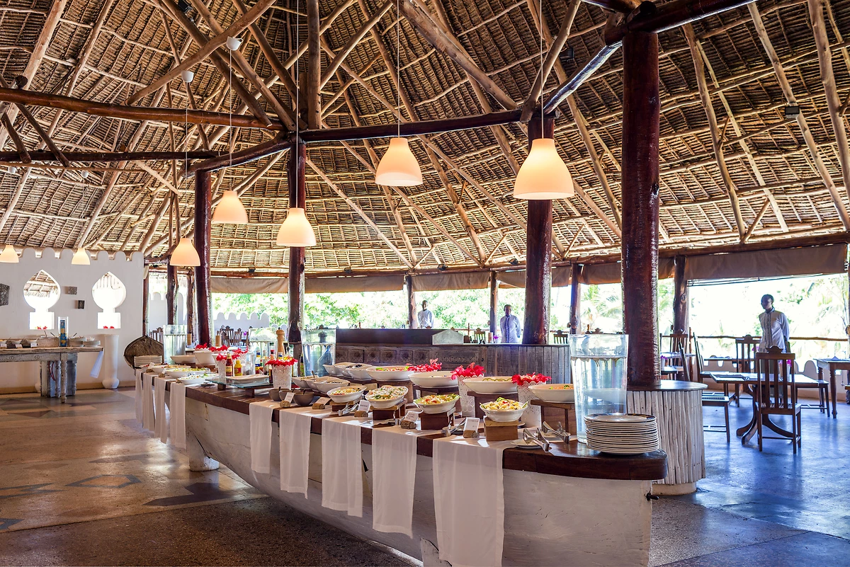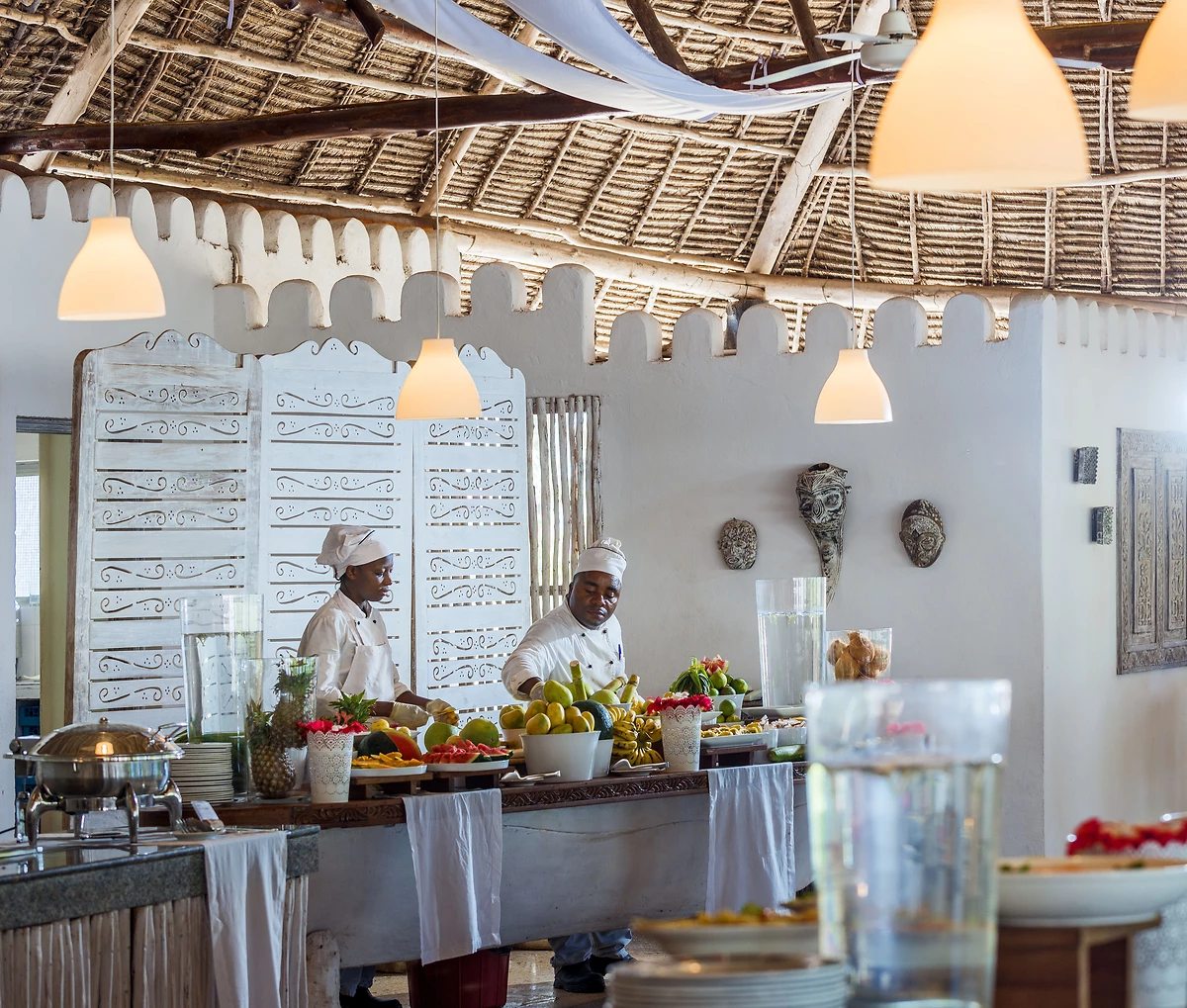 Restaurant principal sous forme de buffet (spécialités locales et plats internationaux). Soirées à thème et dîner africain (1 fois/semaine). Pizzeria Nakupenda (dîner). Le restaurant Ocean Reef Beach Grill sert des menus légers (déjeuner) et Suli Suli, le restaurant à la carte (avec supplément) propose poissons et fruits de mer.